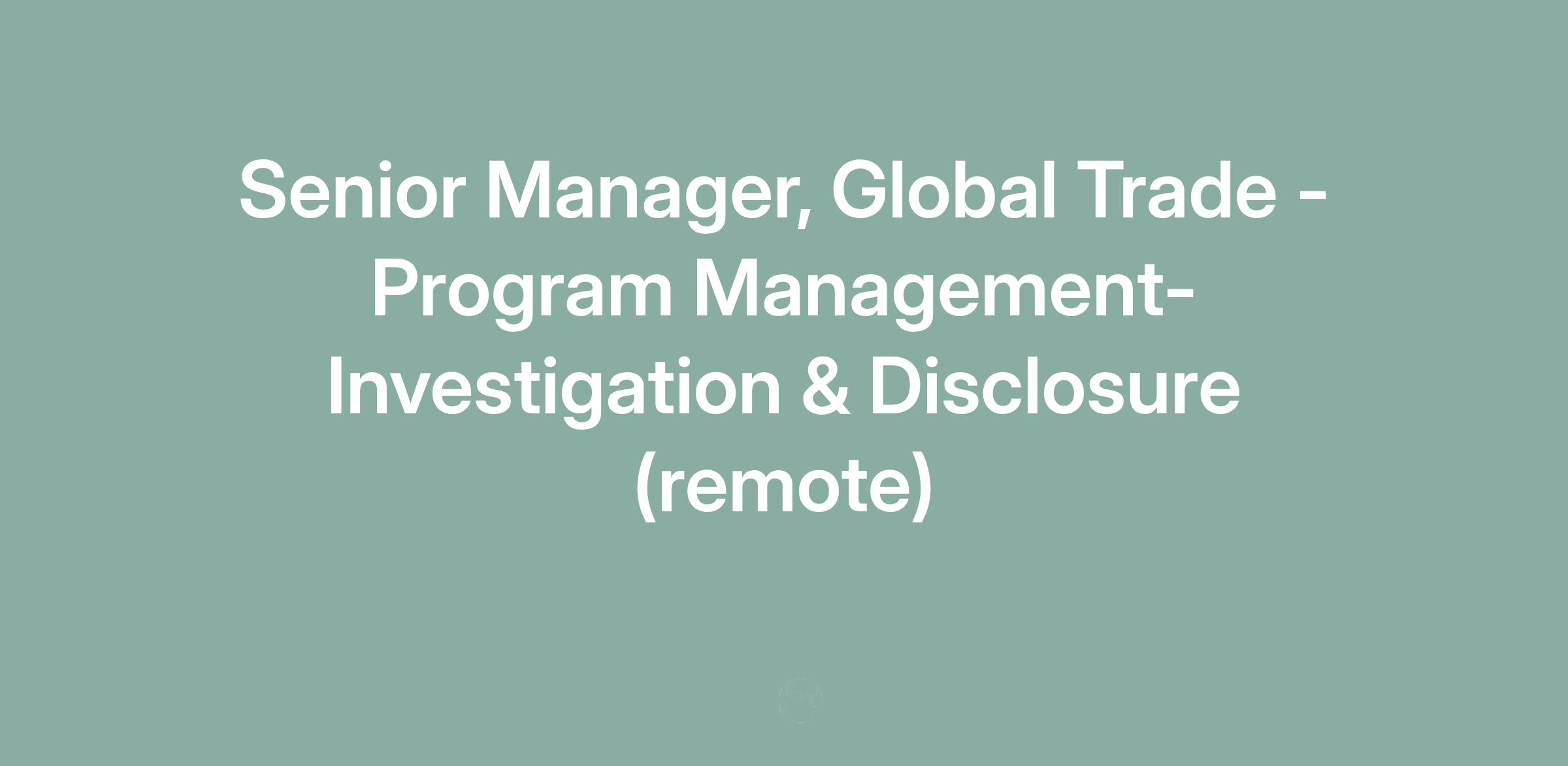 The Senior Manager, Global Trade (GT) will support the Enterprise Operations organization, and the role will be categorized as remote. As part of the Enterprise Operations GT team, the Global Trade Program Management Lead manages a talented team of global trade professionals that includes managers and/or subject matter experts in the GT pillars under his/her responsibility. This position has operational oversight for global trade policy and procedure implementation to ensure Global Trade requirements are met in all Enterprise Operations functional group operations.